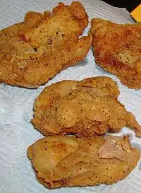 Fried chicken is a capstone of both southern cuisine and history, since it is interwoven into certain people's culture and heritage, particularly the African-American people of the South. The origin of fried chicken's importance to African-American food culture goes back to ancient Egypt, when the first method of frying was created around 2500bce.[12] Egyptians invented the method for frying food in 2500bce. A kitchen in Egypt showed results of fried foods. Over time just about every culture adopted the method of frying food. Being that they came from Africa, African Americans also brought their methods of frying foods with them.[13],[14] During slavery in the 1800s, when the only animals that slaves were allowed to own were yard chickens,[8][15] the African Americans began frying their chicken using the same methods they used to fry other foods. Later in the 1800s, before the Civil War, fried chicken could also be sold by enslaved people to raise money to buy their freedom.[15] Soon, this led to the association of African-Americans in the South and fried chicken.[16] Fried chicken was popularized by African Americans and this helped it become one of the most popular and important southern cuisines in the United States.[8][17] The importance of fried chicken to southern cuisine is apparent through the multiple traditions and different adaptations of fried chicken, such as KFC; Nashville's Prince's Hot Chicken Shack; or the Cajun-inspired Bojangles' Famous Chicken 'n Biscuits and Popeyes Chicken.[15][18][19][20]