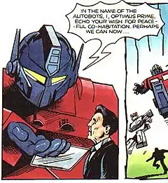 ![]() Ronald Reagan meets Optimus Prime in Marvel Comics Transformers series | |