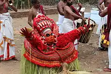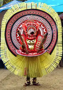 Theyyam is a ritual performance art form[12] that depict the cultural heritage of North Malabar, especially of ancient Kolathunad. Theyyam depicts Shiva bhutaganas, Kali and other deities and cultural heroes. The drama is enacted based on ancient stories and the language used is "Tottam pattu", a primitive form of Malayalam. Theyyam shows the Buddhist influence from centuries ago. Theyyam is usually held from October to May every year. The colour of Theyyam is typically red. Velan is described in the Sangam literature 500 CE. It could have been a tribal ritual art which evolved under Buddhism and the Brahminic revival of Hinduism. This art form is addressed as "Kaliyattom" North of Pazhayangadi Puzha, Kannur, as "Theyyam" South of the river and as "Thira" around Thalassery.[13]
