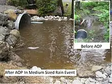 Culvert style replacement is a widespread practice in stream restoration. Long-term benefits of this practice include reduced risk of catastrophic failure and improved fish passage. If best management practices are followed, short-term impacts on the aquatic biology are minimal.[9]