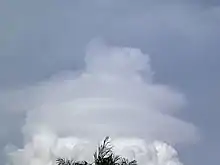 Cumulonimbus velum (Cb vel) (from the Latin cumulonimbus, "column-rain" + velum, "veil") is a cumulonimbus cloud with an accessory cloud veil wrapped around its mid area, representing an area of humid stable air created as a result of the growth of the parent cumulonimbus.[1] The altostratus velum cloud appears dark in comparison to its parent cloud, and can persist even after the cumulonimbus has disintegrated. The velum is very rare, as conditions necessary in development are infrequent.