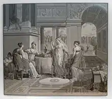 The wedding banquet was a favored theme for Renaissance art. As early as 1497, Giovanni Sabadino degli Arienti made the banquet central to his now-lost Cupid and Psyche cycle at the Villa Belriguardo, near Ferrara. At the Villa Farnesina in Rome, it is one of two main scenes for the Loggia di Psiche (ca. 1518) by Raphael and his workshop, as well as for the Stanza di Psiche (1545–46) by Perino del Vaga at the Castel Sant' Angelo.[20] Hendrick Goltzius introduced the subject to northern Europe with his "enormous" engraving called The Wedding of Cupid and Psyche (1587, 43 by 85.4 cm),[21] which influenced how other northern artists depicted assemblies of the gods in general.[22] The engraving in turn had been taken from Bartholomaeus Spranger's 1585 drawing of the same title, considered a "locus classicus of Dutch Mannerism" and discussed by Karel Van Mander for its exemplary composition involving numerous figures.[23]