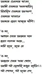 In Bengali cursive script[6] (also known in Bengali as "professional writing") the letters are more likely to be more curvy in appearance than in standard Bengali handwriting. Also, the horizontal supporting bar on each letter (matra) runs continuously through the entire word, unlike in standard handwriting. This cursive handwriting often used by literature experts differs in appearance from the standard Bengali alphabet as it is free hand writing, where sometimes the alphabets are complex and appear different from the standard handwriting.