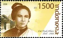 Cut Nyak Dhien or Tjoet Nja' Dhien (1848, Lampadang – November 6, 1908, Sumedang)[1] was a leader of the Acehnese guerrilla forces during the Aceh War. Following the death of her husband Teuku Umar, she led guerrilla actions against the Dutch for 25 years. She was posthumously awarded the title of National Hero of Indonesia on May 2, 1964 by the Indonesian government.[2]