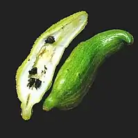 Cyclanthera pedata is a vine that can be 12 m long; the stems are thin; and the leaves can be up to 24 cm long, palmate or pedate in shape.[2] The small flowers can be greenish or white and are borne in racemes.[2] The fruit is light green, ovoid, curved, up to 15 cm long, almost hollow (except for the seeds and a thin flesh layer), with smooth skin or sometimes covered in soft spines; the seeds are black.[2][3]