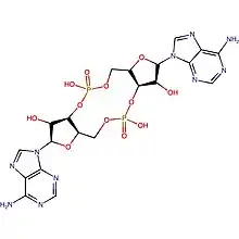 Cyclic di-AMP (also called c-di-AMP and c-di-adenosine monophosphate) is a second messenger used in signal transduction in bacteria and archaea.[1][2][3] It is present in many Gram-positive bacteria, some Gram-negative species, and archaea of the phylum euryarchaeota.[2][3]