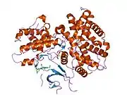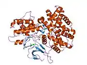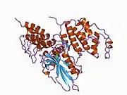 The CDK6 gene is conserved in eukaryotes, including the budding yeast and the nematode Caenorhabditis elegans.[11] The CDK6 gene is located on chromosome 7 in humans. The gene spans 231,706 base pairs and encodes a 326 amino acid protein with a kinase function.[6] The gene is overexpressed in cancers like lymphoma, leukemia, medulloblastoma and melanoma associated with chromosomal rearrangements.[6] The CDK6 protein contains a catalytic core composed of a serine/threonine domain.[12] This protein also contains an ATP-binding pocket, inhibitory and activating phosphorylation sites, a PSTAIRE-like cyclin-binding domain and an activating T-loop motif.[10] After binding the Cyclin in the PSTAIRE helix, the protein changes its conformational structure to expose the phosphorylation motif.[10] The protein can be found in the cytoplasm and the nucleus, however most of the active complexes are found in the nucleus of proliferating cells.[10]