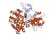Cell division protein kinase 6 (CDK6) is an enzyme encoded by the CDK6 gene.[5][6] It is regulated by cyclins, more specifically by Cyclin D proteins and Cyclin-dependent kinase inhibitor proteins.[7] The protein encoded by this gene is a member of the cyclin-dependent kinase, (CDK) family, which includes CDK4.[8] CDK family members are highly similar to the gene products of Saccharomyces cerevisiae cdc28, and Schizosaccharomyces pombe cdc2, and are known to be important regulators of cell cycle progression in the point of regulation named R or restriction point.[9]