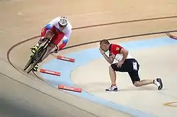 The men's sprint at the 2016 Olympic Games in Rio de Janeiro took place on 12–14 August 2016.[1] There were 27 competitors from 16 nations, as once again nations were allowed to enter up to two cyclists (the limit had fluctuated between one and two since 1928).[2] The event was won by Jason Kenny of Great Britain, successfully defending his gold from 2012 and making it the third straight Games that Great Britain was atop the podium for the sprint. Kenny was the third man to win two consecutive gold medals in the sprint, fourth man to win two golds at any point, and third man to win three medals of any color. He beat his teammate Callum Skinner in the final; it was the second time in three Games that Great Britain had both the top spots—and potentially could have been the third if nations had not been limited to a single cyclist in 2012. Denis Dmitriev earned Russia's first men's sprint medal with his bronze.