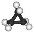 Cyclopropane is the cycloalkane with the molecular formula C3H6, consisting of three carbon atoms linked to each other to form a ring, with each carbon atom bearing two hydrogen atoms resulting in D3h molecular symmetry. The small size of the ring creates substantial ring strain in the structure.