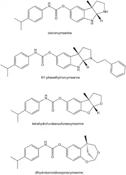 Cymserine is a drug related to physostigmine, which acts as a reversible cholinesterase inhibitor, with moderate selectivity (15×) for the plasma cholinesterase enzyme butyrylcholinesterase, and relatively weaker inhibition of the better-known acetylcholinesterase enzyme. This gives it a much more specific profile of effects that may be useful for treating Alzheimer's disease without producing side effects such as tremors, lacrimation, and salivation that are seen with the older nonselective cholinesterase inhibitors currently used for this application, such as donepezil. A number of cymserine derivatives have been developed with much greater selectivity for butyrylcholinesterase, and both cymserine and several of its analogues have been tested in animals, and found to increase brain acetylcholine levels and produce nootropic effects, as well as reducing levels of amyloid precursor protein and amyloid beta, which are commonly used biomarkers for the development of Alzheimer's disease (potentially indicating the drugs as candidates to be the first medicine capable of stopping, and even reversing, the progression of the disease).[1][2][3][4][5][6]