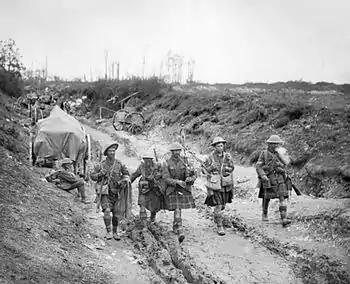 Deverell became Commanding Officer of the 1/4th Battalion, East Yorkshire Regiment in July 1915 and was then asked to command the 20th Brigade from 29 October 1915.[3][8] Promoted to lieutenant colonel on 26 August 1916, he took part in the Battle of the Somme in Autumn 1916.[3] His brigade held a position on the 21st Division's right flank during the Battle of Bazentin Ridge and attacked the Switch Line to the east of High Wood. Promoted to the substantive rank of colonel and temporary major general on 1 January 1917, Deverell was given command of the 3rd Division[3] after its commander, Sir Aylmer Haldane, took over VI Corps.[9]