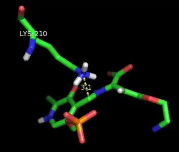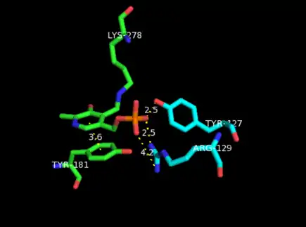 Aside from being bound to a lysine residue, PLP is fixed within the substrate binding site of the enzyme through various interactions with catalytic residues. Amine- and hydroxyl-containing residues are located in hydrogen bonding distance to the four phosphate oxygens.[3] This phosphate group is considered to be the main contributor to securing PLP in the active site. Additionally, residues neighboring the pyridine nitrogen in PLP help stabilize its positive charge, thereby increasing its electrophilic character.[14]