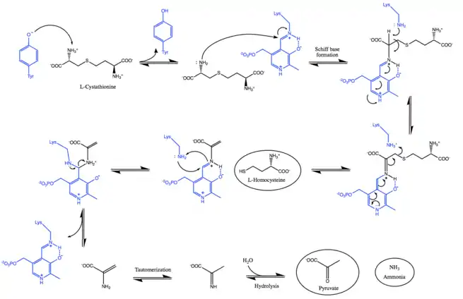 As shown in the mechanism below, cystathionine beta-lyase facilitates the S-C bond cleavage in cystathionine with the use of a PLP cofactor bounded to a catalytic lysine residue.[3][4] Initially, a deprotonated amino group is needed to perform the transaldimination reaction.[13] Given that the pH optimum for the enzyme is between 8.0 and 9.0, a tyrosine residue in the catalytic pocket exists as a phenolate, which abstracts a proton from the α-amino group of the substrate.[5][6] In the next step, the deprotonated amine undergoes a nucleophilic attack and displaces the lysine to form a Schiff base, forming an internal aldimine.