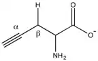 Propargylglycine and β-cyanoalanine are two irreversible inhibitors of cystathionase used to treat elevated H2S levels. Mechanistically, the amino group of propargylglycine attacks the aldimine to form an external aldimine. The β position of the alkyne is then deprotonated to form the allene, which is then attacked by the phenol of Tyr114. The internal aldimine can regenerate, but the newly created vinyl ether sterically hinders the active site, blocking cysteine from attacking pyridoxal phosphate.[2]