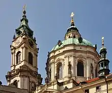 The Baroque style also changed the character of the Czech countryside (churches and chapels in Czech countryside are mostly Baroque).[1] Czech Baroque architecture is considered to be a unique part of the European cultural heritage thanks to its extensiveness and extraordinariness. In the first third of the 18th century the Czech lands (especially Bohemia) were one of the leading artistic centers of the Baroque style. In Bohemia there was completed in a very original way the development of the Radical Baroque style created in Italy by Francesco Borromini and Guarino Guarini. The leading architects of the Czech High Baroque style (also called Radical Baroque of Bohemia) were Christoph Dientzenhofer, Kilian Ignaz Dientzenhofer and Jan Blažej Santini-Aichel.[2]