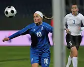 Dóra María Lárusdóttir (born 24 July 1985) is an Icelandic football player who predominantly plays as a winger for Icelandic Úrvalsdeild club Valur. Since 2003 Dóra María has been part of the Iceland women's national team and she participated at the 2009 and 2013 editions of the UEFA Women's Championships. Having played for Valur for a decade and been voted national Player of the Year in 2008 and 2010, Dóra María has for many years been one of Iceland's leading female footballers. After a spell abroad she returned to Valur in 2012.