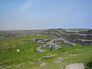 Dún Dúchathair or simply Dúchathair (anglicized Doocaher),[1] meaning "black fort", is a large stone fort on the cliffs at Cill Éinne, (Killeany), Inishmore (one of the Aran Islands) in County Galway, Ireland.[2] Due to erosion, it now sits on a rocky promontory that stretches out into the sea. On its outer side there are large walls, reaching 6 metres high and 5 metres wide. On the inside are the ruins of clocháns. There is also evidence of a cheval de frise protecting the entrance.[3]
