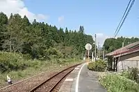Dōgoyama Station features one platform. Two platforms used to be in operation, handling two lines, but after one of the lines ceased operation, the second platform stopped being used.