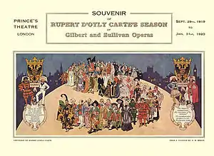 In 1906–07 Mrs. Carte staged a repertory season at the Savoy Theatre, with Gilbert returning to direct.[112] The season, which included Yeomen, The Gondoliers, Patience and Iolanthe, was a sensation[104] and led to another in 1908–09 including The Mikado, Pinafore, Iolanthe, Pirates, The Gondoliers and Yeomen.[113] Afterwards, however, Mrs. Carte's health prevented her from staging more London seasons.[114] She retired and leased the theatre to C. H. Workman, and the company did not perform in London again until 1919, although it continued to tour throughout Britain.[115]