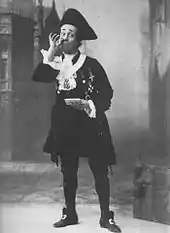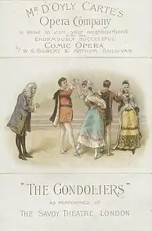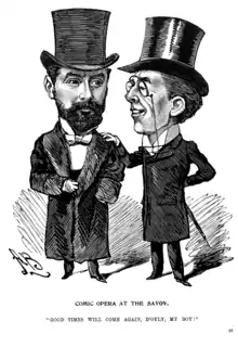 The partnership's next opera was Ruddigore, which opened in January 1887. It satirised and used elements of Victorian stock melodrama.[88] The piece, though profitable, was a relative disappointment after the extraordinary success of The Mikado.[89] When Ruddigore closed after a run of only nine months, the company mounted revivals of earlier Gilbert and Sullivan operas for almost a year. After another attempt by Gilbert to persuade Sullivan to set a "lozenge plot", Gilbert met his collaborator half way by writing a serio-comic plot for The Yeomen of the Guard, which premiered in October 1888.[90] The opera was a success, running for over a year, with strong New York and touring productions. During the run, in March 1889, Sullivan again expressed reluctance to write another comic opera, asking if Gilbert would write a "dramatic work on a larger musical scale".[91] Gilbert declined, but offered a compromise that Sullivan ultimately accepted: The two would write a light opera for the Savoy, and at the same time, Sullivan could work on a grand opera (Ivanhoe) for a new theatre that Carte was constructing to present British grand opera.[92] The new comic opera was The Gondoliers, which opened in December 1889 and became one of the partnership's greatest successes.[93] After Carte's first wife died in 1885, Carte married Helen Lenoir in 1888, who was, by this time, nearly as important in managing the company as Carte himself.[18]