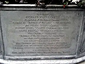 Helen Carte died in 1913, and Carte's son Rupert inherited the company.[n 8] During World War I, he was away serving in the Royal Navy.[64] According to H. M. Walbrook, "Through the years of the Great War [the company] continued to be on tour through the country, drawing large and grateful audiences everywhere. They helped to sustain the spirits of the people during that stern period, and by so doing they helped to win the victory."[124] The company also toured in North America several times, beginning with a Canadian tour in 1927.[125]