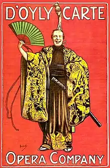 Rupert D'Oyly Carte found the company's productions increasingly "dowdy", however, and on his return from the war, he determined to refresh them, bringing in new designers including W. Bridges-Adams for the sets, and, for the costumes, George Sheringham and Hugo Rumbold. He also commissioned new costumes from Percy Anderson who had worked with Gilbert and Richard D'Oyly Carte on the original productions of the later Savoy operas.[126] Charles Ricketts redesigned sets and costumes for The Mikado (1926) and The Gondoliers (1929). His costumes for The Mikado were retained by all subsequent designers until 1982. In an interview in The Observer in August 1919, Carte set out his policy for staging the operas: "They will be played precisely in their original form, without any alteration to the words, or any attempt to bring them up to date."[127] This uncompromising declaration was modified in a later interview in which he said, "the plays are all being restaged. ... Gilbert's words will be unaltered, though there will be some freshness in the method of rendering them. Artists must have scope for their individuality, and new singers cannot be tied down to imitate slavishly those who made successes in the old days."[64]