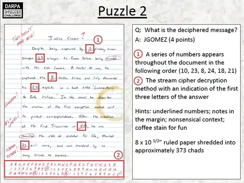 Under the rules of the competition, the $50,000 challenge award would be granted to the first team to submit the answers to questions relating to a hidden mystery. The mystery verified that the team was able to extract meaningful intelligence from the page that was thought destroyed. The secret answers could be acquired by reconstructing five individual puzzles that were created by shredding one or more single-sided hand-written documents.[2]