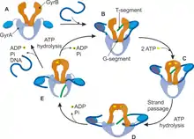 A single molecule study[10] has characterized gyrase activity as a function of DNA tension (applied force) and ATP, and proposed a mechanochemical model. Upon binding to DNA (the "Gyrase-DNA" state), there is a competition between DNA wrapping and dissociation, where increasing DNA tension increases the probability of dissociation. According to the catalytic cycle proposed, binding of 2 ATP molecules causes dimerization of ATPase domains of GyrB subunits and capturing of a T-segment of DNA (T- from transferring) in a cavity between GyrB subunits. On a next step the enzyme cleaves a G-segment of DNA (G- from gate) making a double-strand break. Then the T-segment is transferred through the break, which is accompanied by the hydrolysis of the first ATP molecule. DNA-gyrase ligates the break in a G-segment back and T-segment finally leaves the enzyme complex. Hydrolysis of the second ATP returns the system to the initial step of a cycle.[11] As the result of a catalytic cycle two ATP molecules are hydrolyzed and two negative supercoils are introduced into the DNA template. The number of superhelical turns introduced into an initially relaxed circular DNA has been calculated to be approximately equal to the number of ATP molecules hydrolyzed by gyrase [12] Therefore, it can be suggested that two ATP molecules are hydrolyzed per cycle of reaction by gyrase, leading to the introduction of a linking difference of -2.[13]