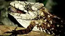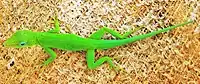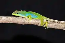 Disregarding color change, minor individual variations in the basic color and pattern, mostly related to sex or age, are common. In some anole species this variation is more pronounced and not only related to sex and age. An example of this is the basic color of the Cayman blue-throated anole, which varies geographically, roughly matching the main habitat at a location.[84] In others it occurs at the same location. This includes the extensive individual variations in the Guadeloupean anole, which however also shows some geographic variations, but possibly not consistent enough (due in part to clines) to make the typically recognized subspecies valid.[23][85][86] In the Puerto Rican giant anole, a species only able to perform minor color changes (essentially lightness/darkness), juveniles are gray-brown and adults typically green, but an uncommon morph maintains a gray-brown color into adulthood.[83] Similarly, rare morphs of the usually green Carolina anole lack certain pigment cells, giving them a mainly turquoise-blue or yellow color.[87][88]