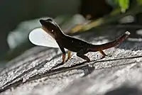 The tail of anoles varies, but mostly it is longer than the snout-to-vent length. Depending on exact species it can range from slightly shorter to about three times the snout-to-vent.[1][8][51][52] The Caribbean twig ecomorph anoles, proboscis anole and "Phenacosaurus" anoles have a prehensile tail.[53][54][55] Semi-aquatic anoles tend to have relatively tall, vertically flattened tails that aid in swimming.[56]