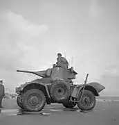 The Daimler Armoured Car was a parallel development to the Daimler Dingo "Scout car", a small armoured vehicle for scouting and liaison roles. It was another Birmingham Small Arms design. A larger version designed on the same layout as the Dingo fitted with the turret similar to that of the Mark VII Light Tank and a more powerful engine.[2] Like the scout car, it incorporated some of the most advanced design concepts of the time and is considered one of the best British AFVs of the Second World War. The 95 hp engine was at the rear linked through a fluid flywheel to a Wilson preselector gearbox and then a H-drive arrangement with propshafts to each wheel. Four wheel steering similar to early models of the Scout car was considered but not implemented following experience with the Dingo.