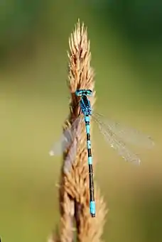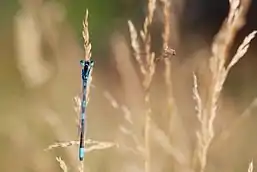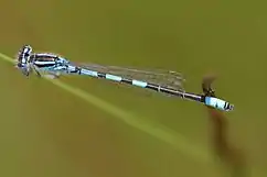 The dainty damselfly (Coenagrion scitulum), also known as the dainty bluet, is a blue damselfly of the family Coenagrionidae. This is a scarce species found mainly in southern Europe, northern Africa, southwest Asia, and Central America. C. scitulum are Odonata (dragonflies & damselflies) predators that can reach a length of 30–33 mm at maturity and have hind-wing lengths of 15–20 mm.[1] The males and females do exhibit differing features through their colouration making them easily distinguishable. As shown in the photo to the left, segment eight is blue in colour followed by black markings on segment nine, whereas the females are mostly black near the rear with smaller blue markings.[2] Although they are relatively simple to sex, they are easily confused with the common blue damselfly.[2]