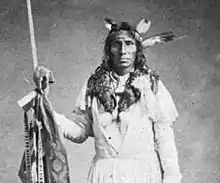 In the 1600s, Mdewakanton Dakota fled their ancestral home of Mille Lacs Lake in northern Minnesota in response to westward expansion of the Ojibwe nation.[12] According to Dakota tradition, their ancestors pushed out the Iowa who were found settled at the mouth of the Minnesota River.[13] In 1680, the Mdewakanton Dakota were contacted by French explorer Daniel Greysolon, Sieur du Lhut, and the Mendota (mdo-TE) band of the Mdewakanton south of the Minnesota River were contacted by Joseph Nicollet in the 18th century.[14] While Taoyateduta (a.k.a. Little Crow) led the Mendota in northern Dakota County, upstream to the southwest, Chief Black Dog established his village of 600 people around 1750 at the isthmus between Black Dog Lake (which is named after him) and the Minnesota River, near the present site of the Black Dog Power Plant.[12][15]