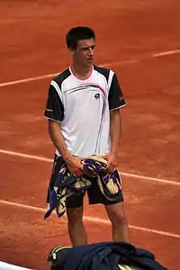 Damir Džumhur (Bosnian pronunciation: [dǎːmir dʒûmxur] JOOM-hoor;[2] born 20 May 1992) is a Bosnian professional tennis player and currently Bosnia and Herzegovina's No. 1 player.[3] He is a member of the Bosnia and Herzegovina Davis Cup team,[4] and he competed at the 2016 Summer Olympics, being selected as the first male tennis player from his country to do so.