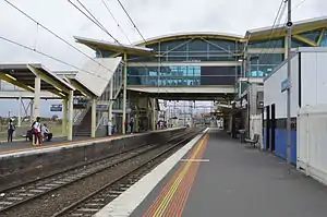 Dandenong has one side platform and one island platform with two sides. Access to the platforms is provided by stairs and lifts from an overhead concourse. The side platform (platform 3) features a kiosk and an enclosed waiting room containing a customer service window and toilets. It is serviced by Metro Trains' Pakenham and Cranbourne line services,[8][9] and by V/Line's Traralgon and Bairnsdale services.[10][11]