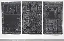 Twelve Apostles is a large-scale drawing made with inkjet on canvas to create a complexly layered scene, juxtaposing modern images against not only historical and contemporary building facades, but the medium of tapestries as well. The influence of architectonics is also integral to the finished work. Arango values structure and intends for it to be a "departure point from which a freer imagining of form and structure may be conjured."[6] He has cited his Catholic upbringing as the source for his interest in religion, as well as being influenced by Aubrey Beardsley and the Art Nouveau movement and Belgian artist Wim Delvoye, whose work also explores the dynamics of the visceral workings of biological consumption.[2]