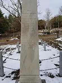 In 1681, resigning his positions at Cambridge, Gookin began his services as a minister. He assisted the Apostle Eliot in his work among the Indians at Natick, and is described by him as " a pious and worthy young man." In Natick Gookin preached in English without learning the Nipmuc language, so the Natick congregation requested a translator be allowed, so Daniel Takowompait, an indigenous pastor, was selected as a pastor there.[3][4] In March, 1685, he was ordained pastor of the church at Sherborn, with an annual salary of "twenty pounds in money and twenty pounds in country pay." Here Gookin preached for many years, both to his parishioners and to the Indians, and here his death occurred, after a long illness, 8 January 1717/18. William Rider of Natick wrote to the editor of the News-Letter as follows :