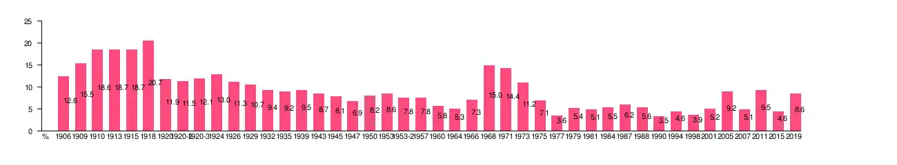 After 1945 the party continued with its pragmatic ways, influencing either as coalition partner as parliamentary support. From 1957 to 1964 they served as coalition partners in a Social Democratic led government, while Hilmar Baunsgaard served as Prime Minister 1968–1971 in a coalition government with Venstre and the Conservative People's Party as partners. In the 1968 general elections the party reached an all-time high of 15% of the vote, while they only received 11.2% in the 1973 landslide election.