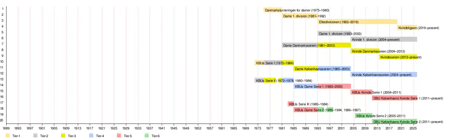 The timeline below lists the evolution of the women's tiers and leagues related to the Danish FA and DBU Copenhagen, specifically the women's association football being administrated by the Danish FA since 1972. Excluded are the women's national championship in the first two seasons (1973 and 1974), which were end-of-the season cup tournaments.