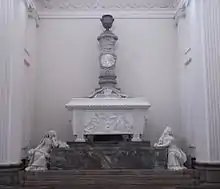 The earliest traces of sculpture in Denmark date from the 12th century when a stonemason known as Horder was active in the east of Jutland and on the island of Funen decorating churches, especially doors and fonts.[2] From roughly the same period, there are sculpted figures in the granite reliefs depicting the Removal from the Cross in the tympanum above the so-called Cat's Head Door of Ribe Cathedral.[3] In the early 16th century, sculpted altarpieces and pulpits were produced by German artists such as Claus Berg working in Odense Cathedral and Hans Brüggemann who designed the unpainted altarpiece in Schleswig Cathedral. However the Reformation in 1536 brought such decorative work to an almost total stop.[4] During the Renaissance period, sculptors from abroad were the source of work in Denmark. The Flemish sculptor Cornelis Floris from Antwerp produced tombs for Herluf Trolle and Birgitte Gøye (1566–68) in Herlufsholm and for Christian III (1569–79) in Roskilde Cathedral. Gert van Groningen was one of the leading Dutch artists to participate in the design of Kronborg's main entrance. Another Flemish sculptor active towards the end of the 16th century in Denmark was Gert van Egen who designed Frederik II's tomb in Roskilde Cathedral.[5] Similarly, in the 17th century, it was Adriaen de Vries who designed the Neptunus Fountain for Frederiksberg Palace (1615–22) although it was later taken by the Swedes as a prize of war and now stands before Drottningholm Palace.[6]