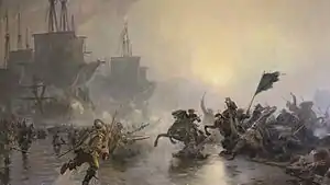 Even then, Eberstein refused to ask Schack for assistance in the battle. Colonel Ditlev Ahlefeldt of the allied forces would not to let pride and vanity be the downfall of the attack and pleaded with Schack to attack. Shack brandished his rapier and mounted a forceful attack into the Swedish left flank. A bloody engagement ensued, but the Swedish cavalry was no match for the rested Danish forces—they fled towards Nyborg leaving the infantry defenseless. The Polish riders showed no pardon, cutting down the Swedish infantry almost to a man.[34] The Dutch also intervened with an expeditionary fleet led by Michiel Adriaenszoon de Ruyter.