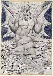 In Dante's Inferno, Satan is portrayed as a giant demon, frozen mid-breast in ice at the center of Hell. Satan has three faces and a pair of bat-like wings affixed under each chin. As Satan beats his wings, he creates a cold wind that continues to freeze the ice surrounding him and the other sinners in the Ninth Circle. The winds he creates are felt throughout the other circles of Hell. In his three mouths, he chews on Judas Iscariot, Marcus Junius Brutus, and Gaius Cassius Longinus. Scholars consider Satan to be "a once splendid being (the most perfect of God's creatures) from whom all personality has now drained away".[1] Satan, also known as Lucifer, was formerly the Angel of Light and once tried to usurp the power of God. As punishment, God banished Satan out of Heaven to an eternity in Hell as the ultimate sinner. Dante illustrates a less powerful Satan than most standard depictions; he is slobbering, wordless, and receives the same punishments in Hell as the rest of the sinners. In the text, Dante vividly illustrates Satan's grotesque physical attributes.
