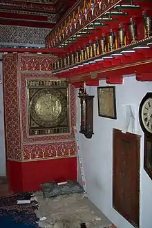 The Dar al-Muwaqqit of Fes's most important mosque was added by the Marinids in 1286 when renovations were carried out on the mosque's old minaret.[10]:62 The chamber was equipped with astrolabes and all manner of scientific equipment of the era in order to aid in this task.[10] It also housed a number of historical water clocks mentioned in historical sources, of which one survives today. The first was commissioned by the Marinid Sultan Abu Yusuf Ya'qub in the 13th century and designed by Muhammad ibn al-Habbak, a faqih and muwaqqit.[11][12] Another one was constructed on the orders of Sultan Abu Sa'id in 1317 and was restored in 1346.[10]:62[13]:492 However, the only one to survive today (though no longer functional) is the water clock of Al-Laja'i. It was made on the order of the Sultan Abu Salim Ali II (r. 1359-1361) by the muwaqqit Abu Zayd Abd al-Rahman ibn Sulayman al-Laja'i (d. 1370). Al-Laja'i had studied mathematics with Ibn al-Banna al-Marrakushi at the Al-Attarine Madrasa. The clock was finished and put in place on 20 November 1361, two months after the death of the sultan.[14][15]