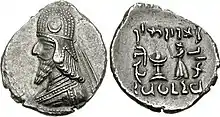 In the silver drachmas of Darayan II, on the obverse, the king is wearing a tiara with a crescent and star symbol, earflap, and decorated with precious stones. On the reverse, the king is facing a fire altar & holding a scepter, with an inscription in Aramaic dâryw mlk' brh wtprdt mlkâ ("Darius the King, son of Wadfradad the King").[2]