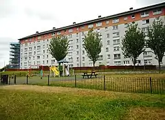 Over three phases a total of 1,336 deck-access apartment blocks, in heights of between two seven stories and with inter-linking pedestrian access corridors, were built.[8][6] This fell short of the initial number planned owing to a combination of economic, political and management setbacks. It was intended that Darnley would be a largely self-supporting estate and for this reason, two primary schools and a community centre formed part of the Council's plans. A social club and bowling green, a church, a small shopping centre and a library were all added throughout the 1970s.[7]