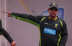 Darren Scott Lehmann (born 5 February 1970) is an Australian cricket coach and former cricketer of German-Australian descent, who coached the Australian national team.[1] Lehmann made his ODI debut in 1996 and Test debut in 1998. He was on the fringes of national selection for the entirety of the 1990s, and only became a regular in the ODI team in 2001 and Test team in late 2002, before being dropped in early 2005. Primarily an aggressive left-handed batsman, Lehmann was also a part-time left arm orthodox bowler, and gained renown for his disregard for physical fitness and modern dietary regimes. He announced his retirement from first-class cricket in November 2007.[2]