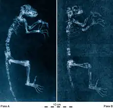 The type specimen is missing only its left rear leg. It has been named Ida[4] after the daughter of Jørn Hurum, the Norwegian vertebrate paleontologist from the Natural History Museum, University of Oslo, who secured one section of the fossil from an anonymous owner and led the research.[23] In addition to the bones, remains of Ida's soft tissue and fur outline are present along with remnants of her last meal of fruit and leaves. The animal is about 58 cm (23 in) from nose to tail, or roughly the size of a small, long-tailed cat.
