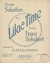 In 1922, in England, Das Dreimäderlhaus was adapted as Lilac Time by Adrian Ross with music by George H. Clutsam. Clutsam, an Australian composer, moved to London and wrote, among other things, a 1912 biography of Schubert.[10] Later, he turned to the more profitable field of composing scores for musical comedies. Clutsam's adaptation hews more closely to Berté's original than does Romberg's. Lilac Time opened at the Lyric Theatre on December 22, 1922 and ran for 626 performances,[11] The production was directed by Dion Boucicault; the musical director was Clarence Raybould.[12] The cast at the London premiere was: