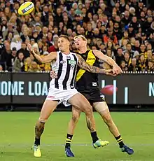 Astbury underwent minor hip surgery in the lead-up to the 2016 season, but still managed what the Herald Sun labelled a "brilliant" pre-season training campaign.[56][57][58] With the move of veteran defender Troy Chaplin to a new forward-line role, Astbury was the natural replacement as a key defender alongside All-Australian Alex Rance in the Richmond defence.[59] He played that role in the club's first pre-season match in February but missed a large portion of the game after sustaining ligament damage to his thumb.[60][61] The injury would require surgery and forced Astbury to sit out the remainder of the pre-season series.[61] He was back to full health by late March however, and earned selection to the club's AFL side in round 1.[62][63] In round 4 Astbury suffered another injury, this time in the form of a rolled ankle that ended his night in the fourth quarter of that match.[64] He did not miss a game as a result of the injury however, instead playing a further two matches at AFL level before being omitted form the club's round 7 side due to poor form.[65] Astbury returned to senior football after three weeks away, recording 11 marks in a win over Essendon in the marquee Dreamtime at the 'G match.[66][16] He did not miss another match that year, playing in each of the final 13 matches of the season.[16] After 14 rounds Astbury led all Richmond players for average intercept marks per game (2.3) while placing 16th in the league for that same statistic.[67] In round 15, he recorded a career-best 23 disposals in a match against Port Adelaide.[68] Five weeks later he set a new career-best for marks, taking 14 in his club's round 20 win over Collingwood.[69] By season's end Astbury had played in a total 19 matches, the most of any year of his career to-date.[16] He earned an 11th-placed finished in the club best and fairest count that year, with his 27 votes placing him just one vote behind tenth placed Brett Deledio.[70] During the off-season Astbury avoid the contract drama of the year previous, having quietly signed a new three-year deal to keep him at Richmond until the end of the 2019 season.[71]